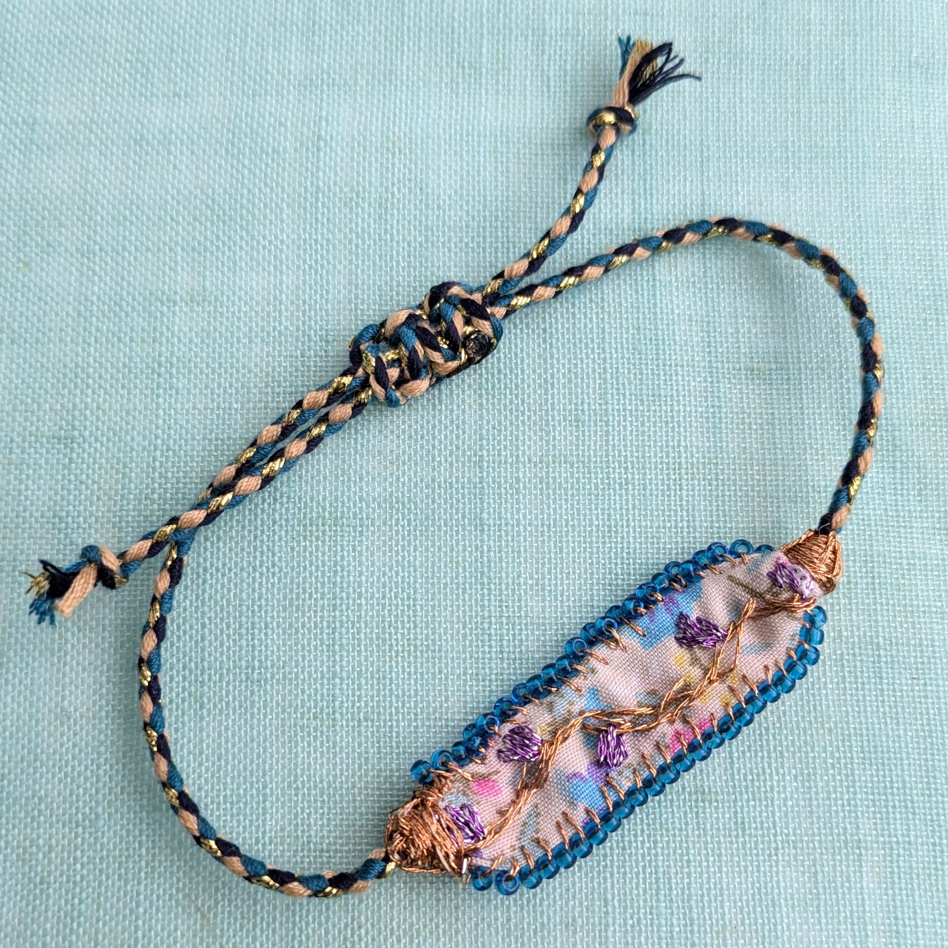 Handmade from vintage floral fabric. It features delicate hand embroidery and beadwork on an adjustable braided cord band.